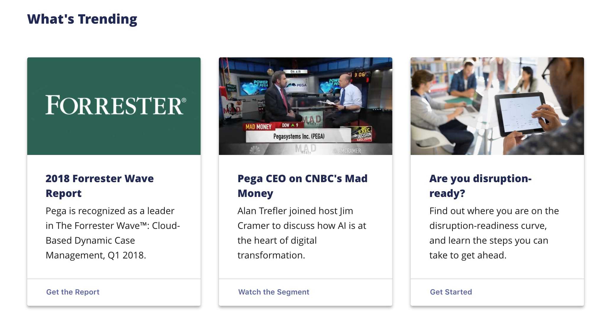 When creating a layout that includes a number of calls to action, such as a trio of cards, use the text style button instead of primary or secondary button styles to minimize cognitive overload.